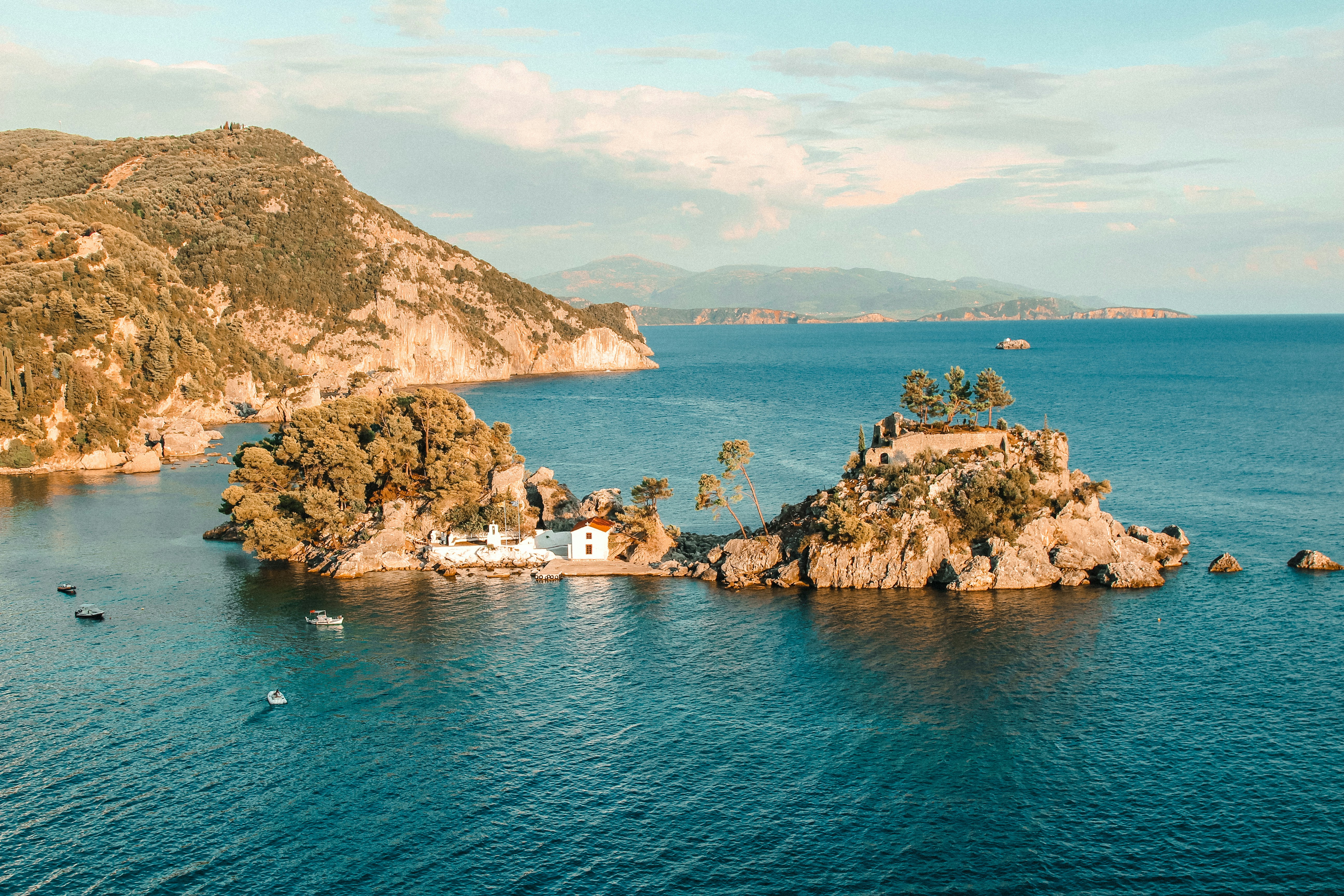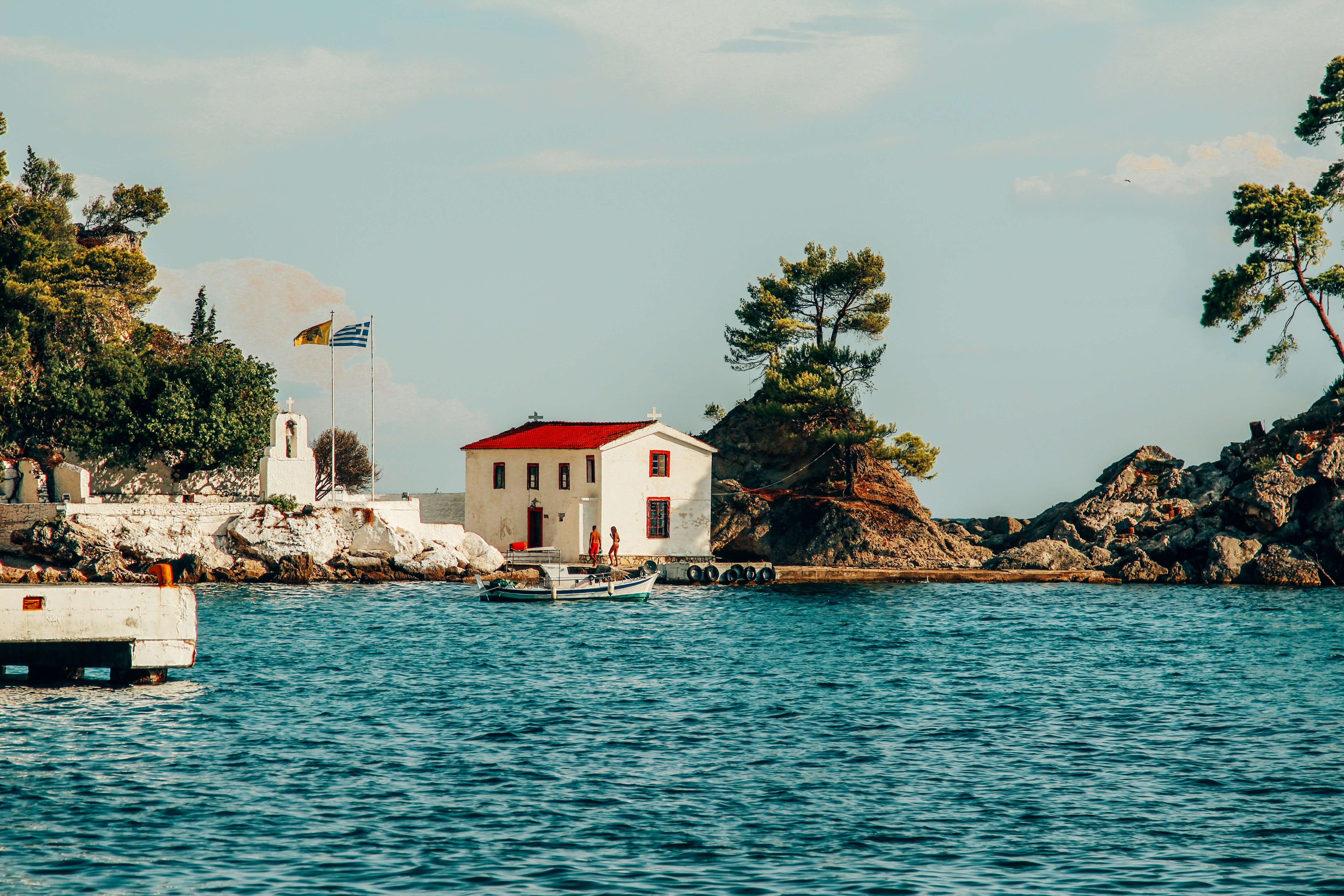 White-brick boathouse on a small private island in Parga, Greece.